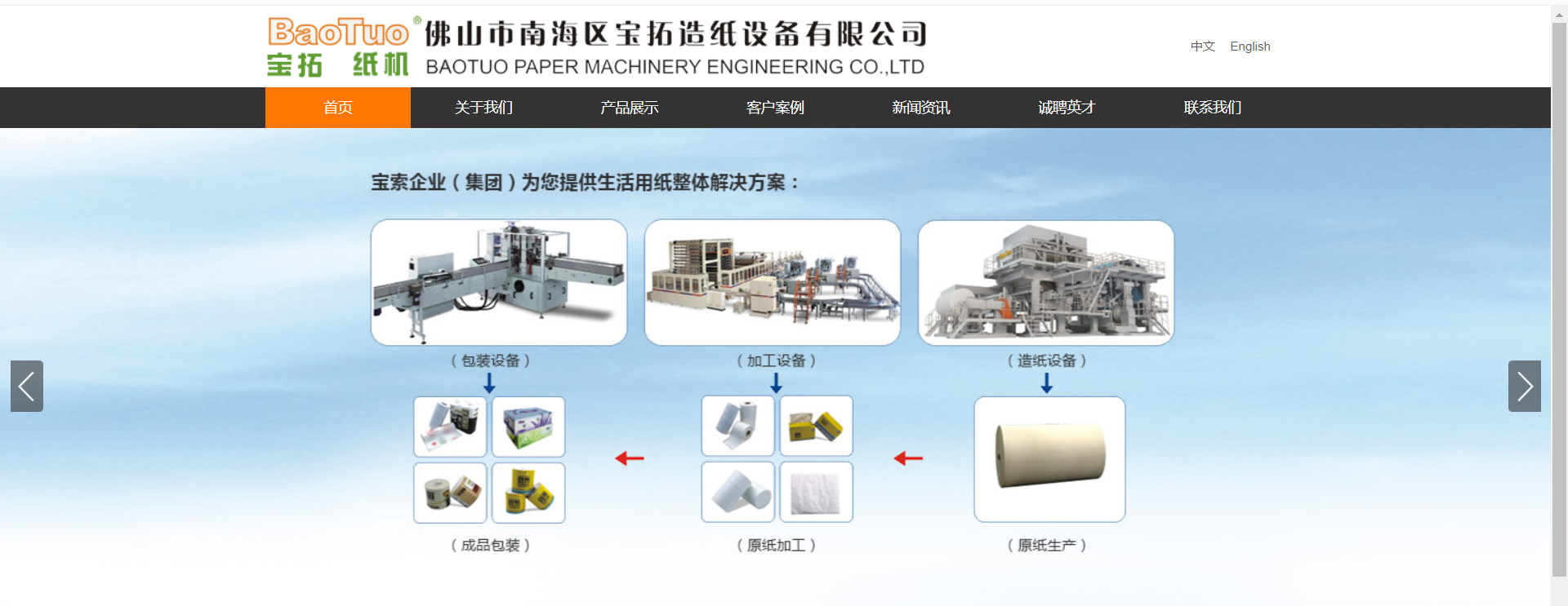 根據(jù)市場需求,寶拓公司依托綜合完善的寶索企業(yè)生產(chǎn)基地,通過交鑰匙工程,竭誠為客戶提供整套生活用紙項(xiàng)目工程解決方案。